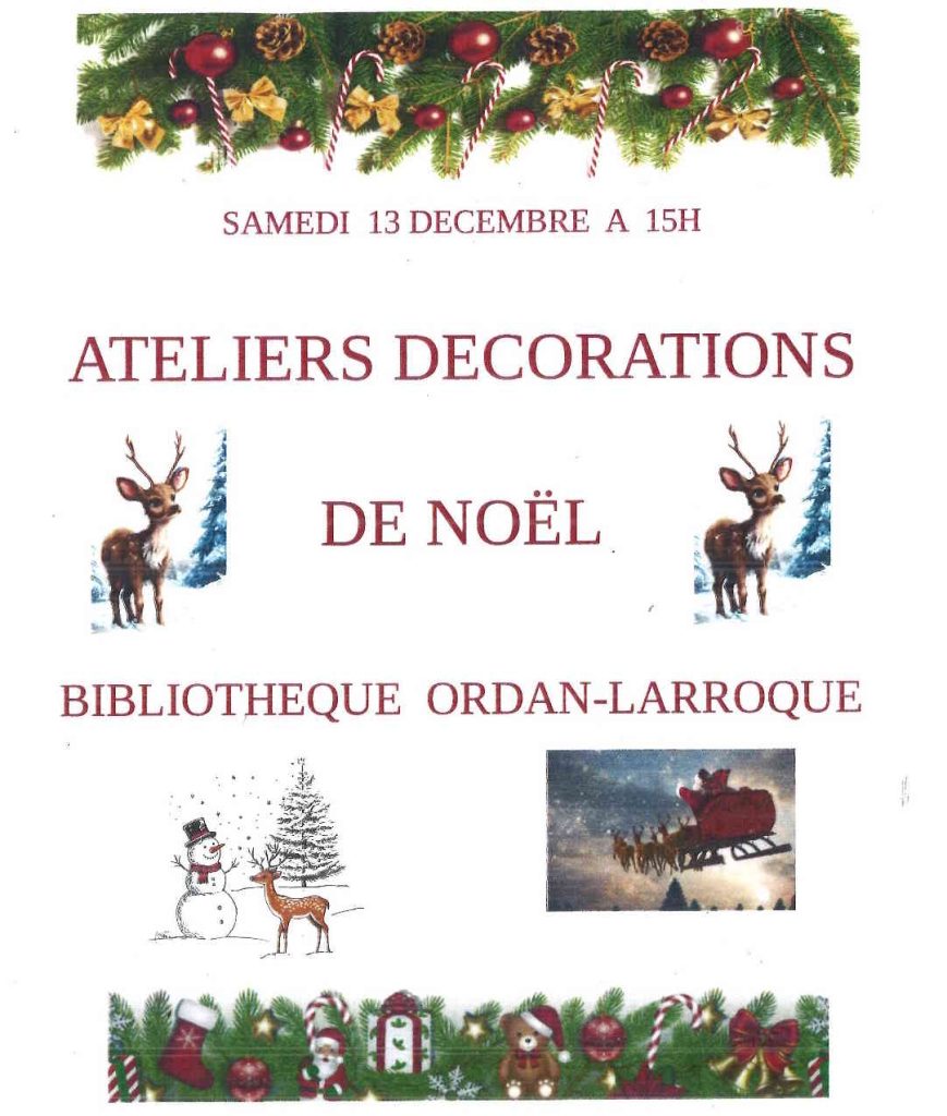 Ateliers décorations de Noël, samedi 13 décembre à 15h à la bibliothèque d’Ordan-Larroque.