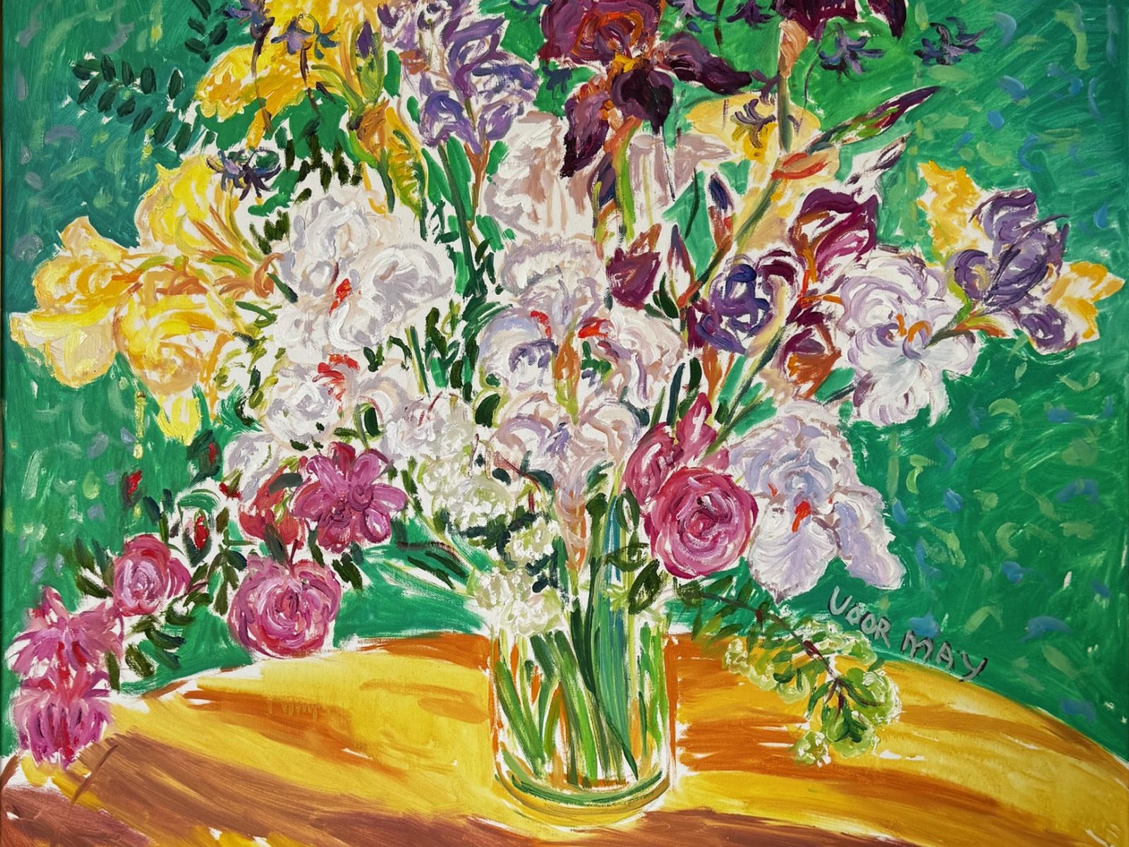 Ici nous présentons ses flamboyantes peintures : ses paysages, ses fleurs, un choix pour être en accord avec la foire aux plantes, cette foire qu’elle affectionnait tant.